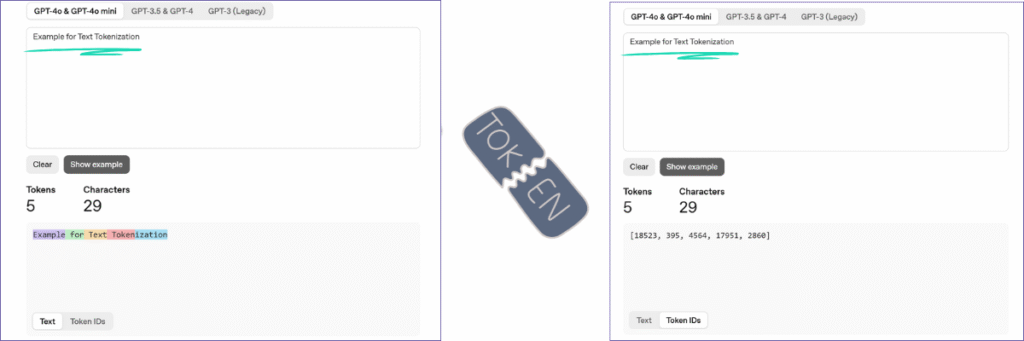 בהזנת המשפט “Example for Text Tokenization”, המערכת מזהה חמש יחידות בסיס. מילים ארוכות מפוצלות לצורך אופטימיזציית חישוב. המילה “Tokenization” מפוצלת לשני טוקנים נפרדים.
